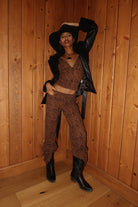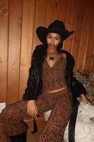 Cognac zebra flare pants made for the spotlight. The Silver Springs Cognac Zebra Flare Pants mix statement print with a curve-flattering fit that lengthens every step. Pair with the matching tank for a coordinated look, or swap in a neutral knit to let the print pop.