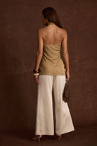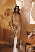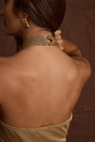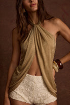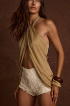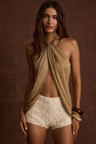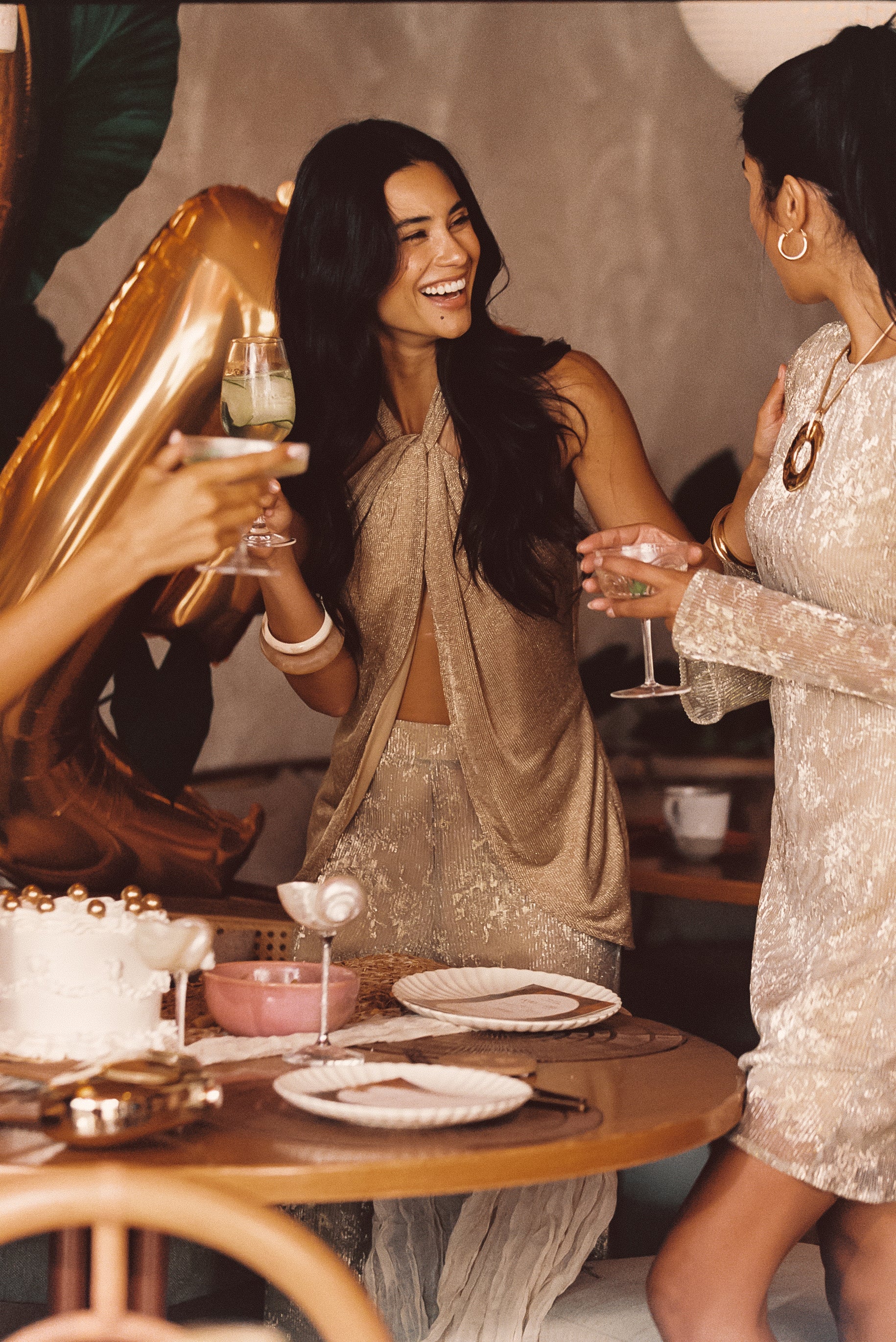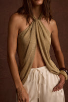 Saved. Shared. Sold out. and now? Reinvented. With the halter neckline and long flyaway silhouette you love, now in the dreamy gold lurex knit material. Pair with micro mini skirts and shorts and shimmery accessories and own the spotlight wherever you go.