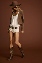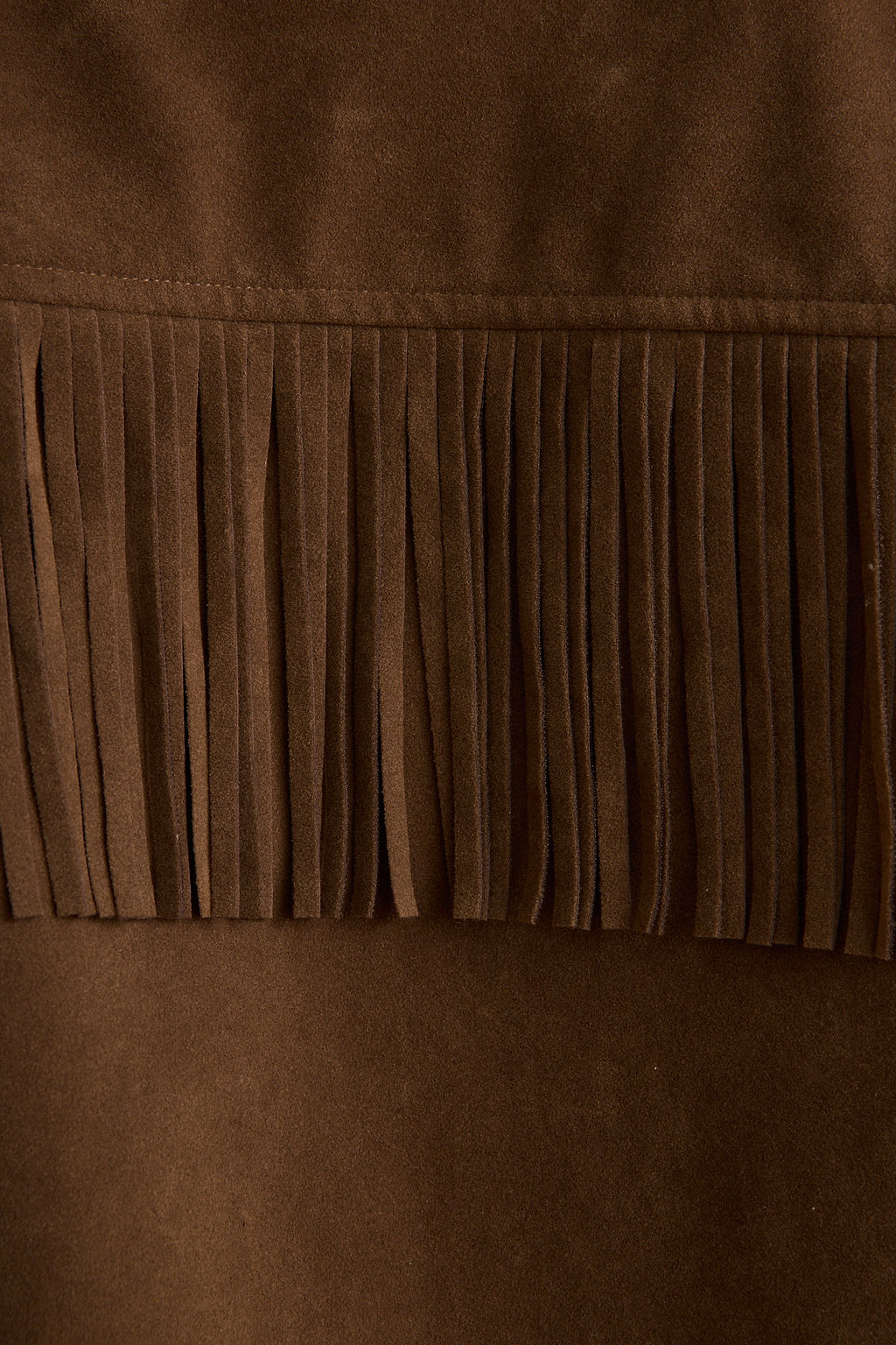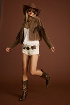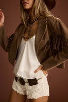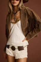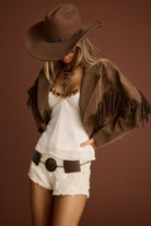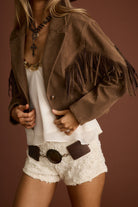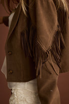 Add a little sway to your step. The Nirvana Brown Jacket pairs soft vegan suede with fringe detailing and a cropped fit for instant edge. Button it up or leave it open, either way you add instant style points to any ‘fit.