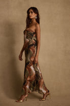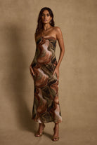Natalia Olive and Rust Abstract Strapless Maxi Dress