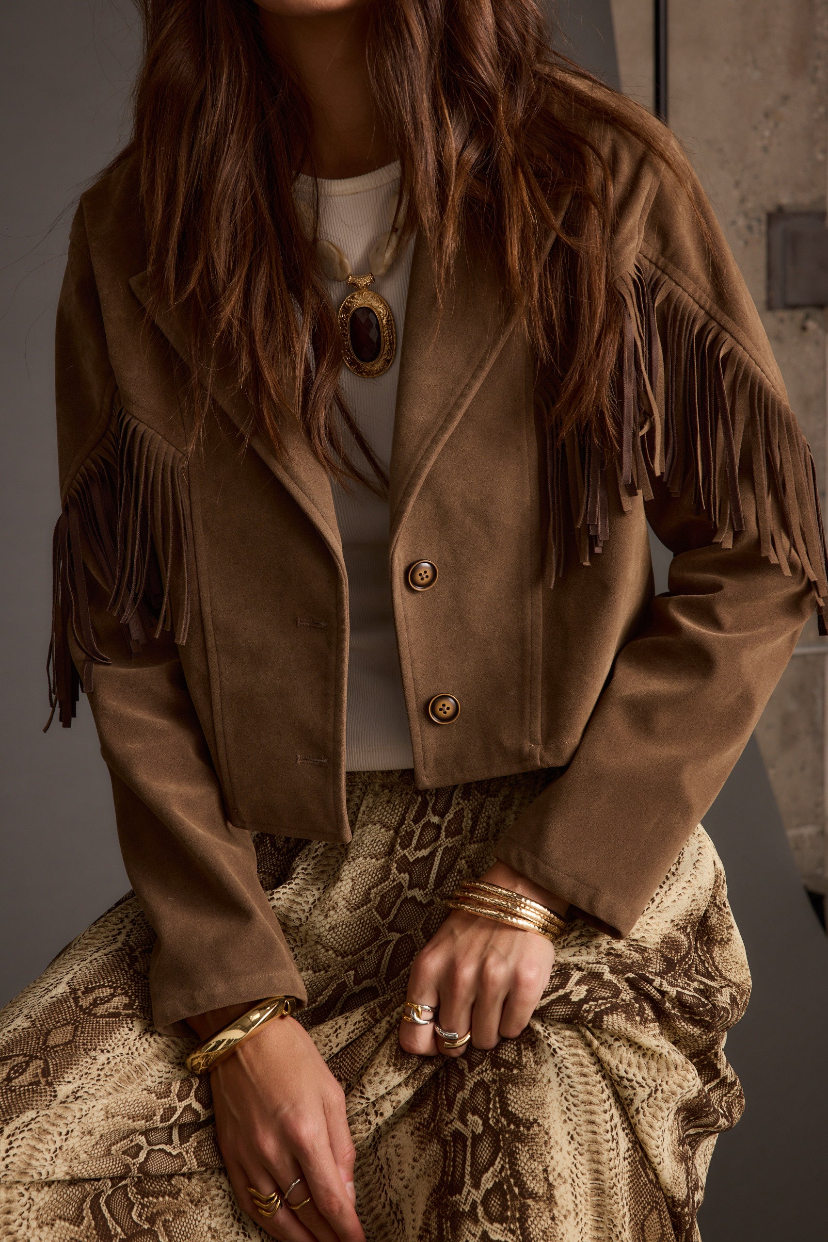 Add a little sway to your step. The Nirvana Brown Jacket pairs soft vegan suede with fringe detailing and a cropped fit for instant edge. Button it up or leave it open, either way you add instant style points to any ‘fit.