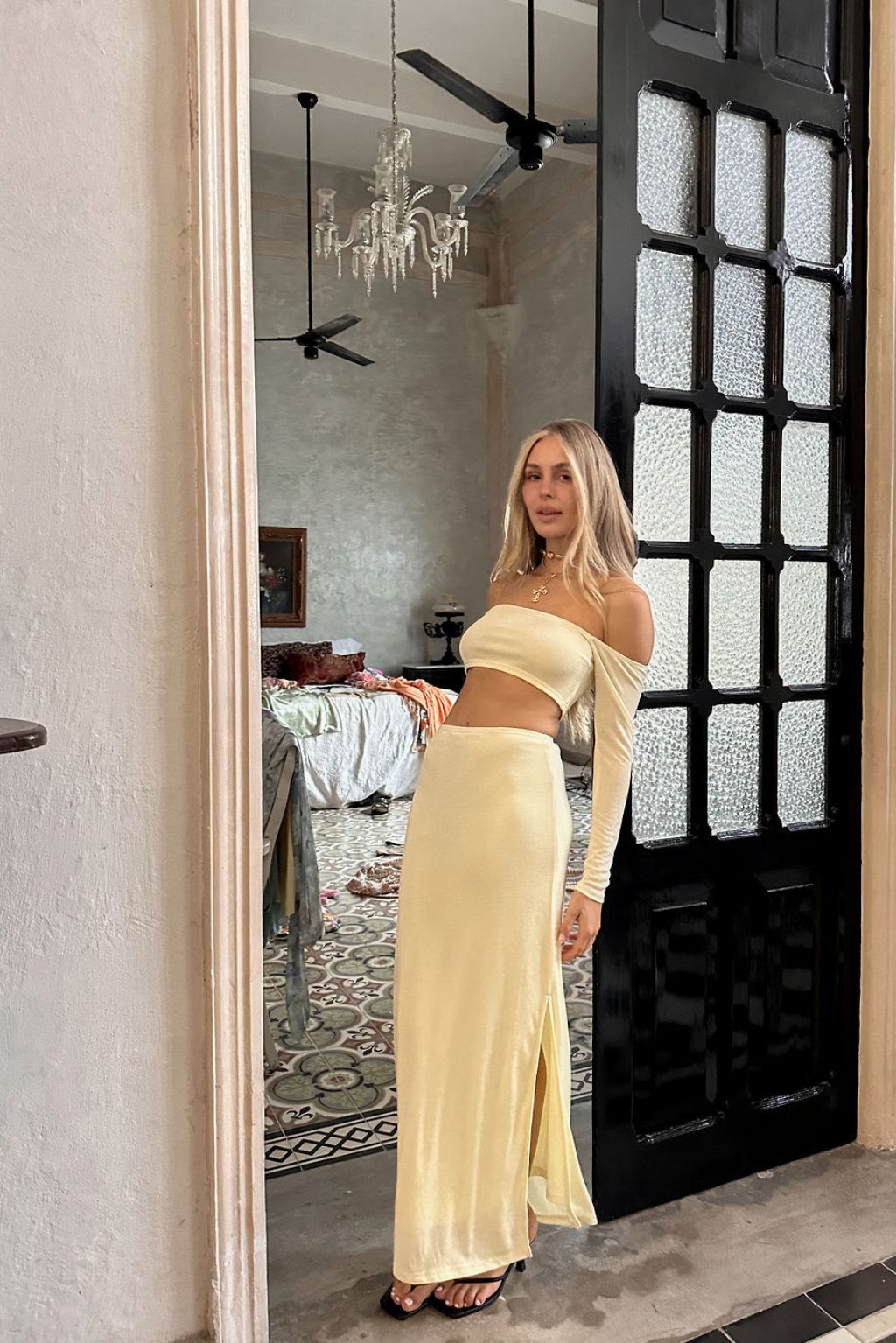 Annabelle Denim Ruffle Trim Maxi Skirt