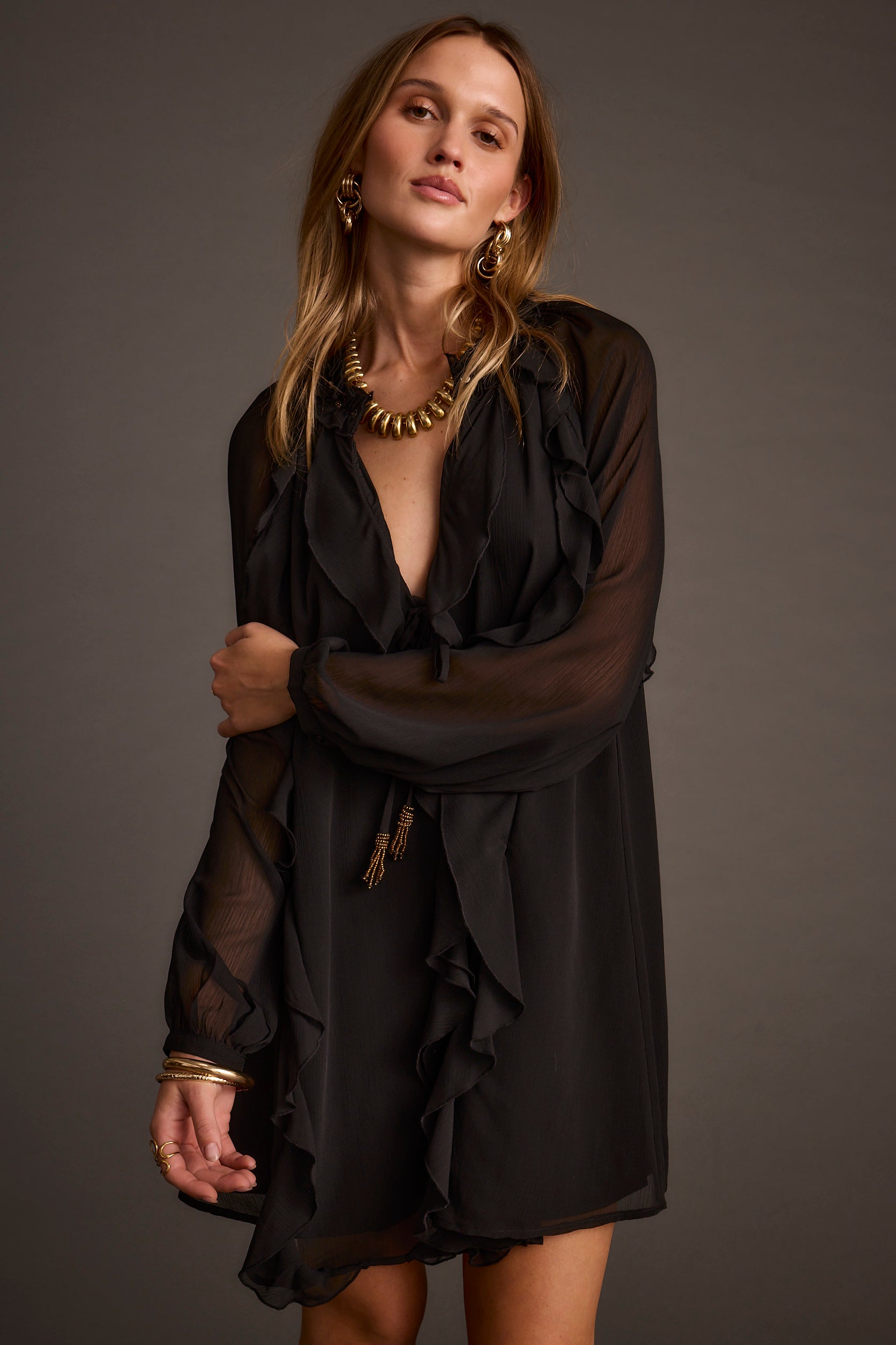 If you’re getting ready for holiday dinners or a night out, the Alice Black Chiffon Mini Dress is the perfect throw-on piece. The flowy A-line fit, sheer lantern sleeves, and ruffled neckline make it an instant go-to, and the beaded tassel ties add just the right detail.