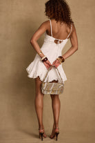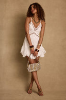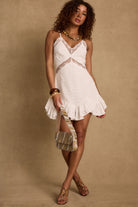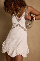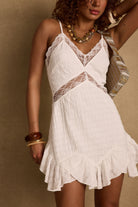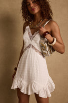 Flirting with the breeze and stealing the scene, the Essence White Trapeze Mini Dress is your vacation go-to. Featuring a delicate lace v-neckline, lace insets, and playful ruffles at the hemline, its playful silhouette moves as freely as you do. Pair it with strappy sandals for daytime exploring or a sun-kissed glow and heels for sunset dinners.