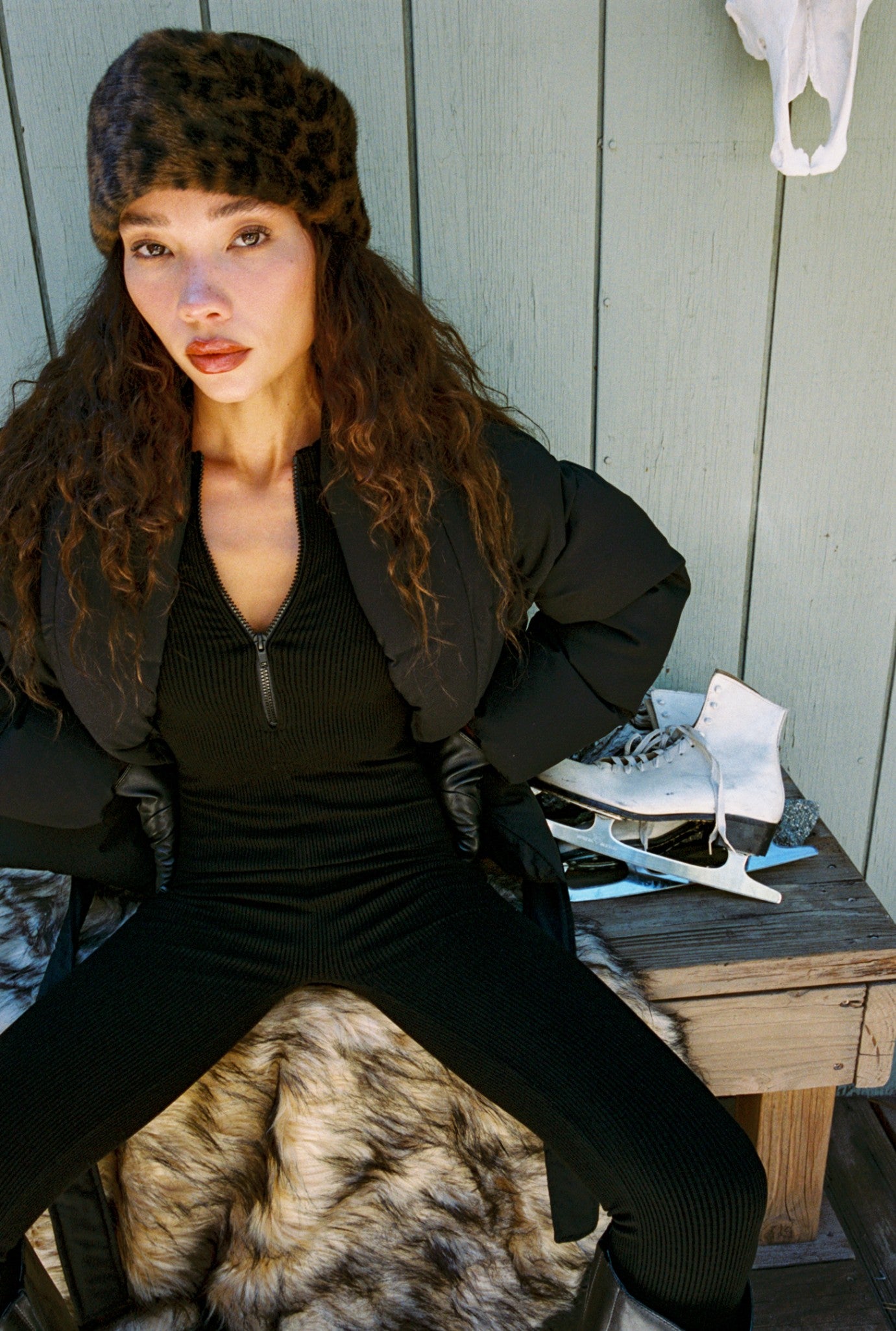 Complete the look with the Misty Brown Faux Fur Coat or a winter-ready jumpsuit like The Après Black Ribbed Knit Jumpsuit.