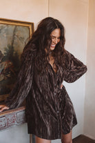 If velvet had a main character moment, it’d be Loretta. Rich espresso tones, gold foil shimmer, and balloon sleeves bring all the party energy without trying too hard. She’s basically your holiday alter ego.