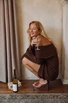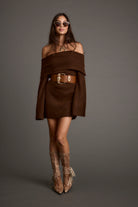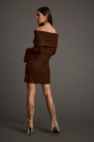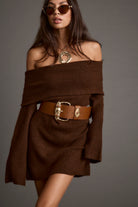 The definition of sweater-weather chic. The Olivia Cinnamon Mini Dress features an off-the-shoulder foldover neckline, soft bell sleeves, and a shift silhouette that moves with you. Cozy knit comfort, styled for everything from coffee runs to cocktails.