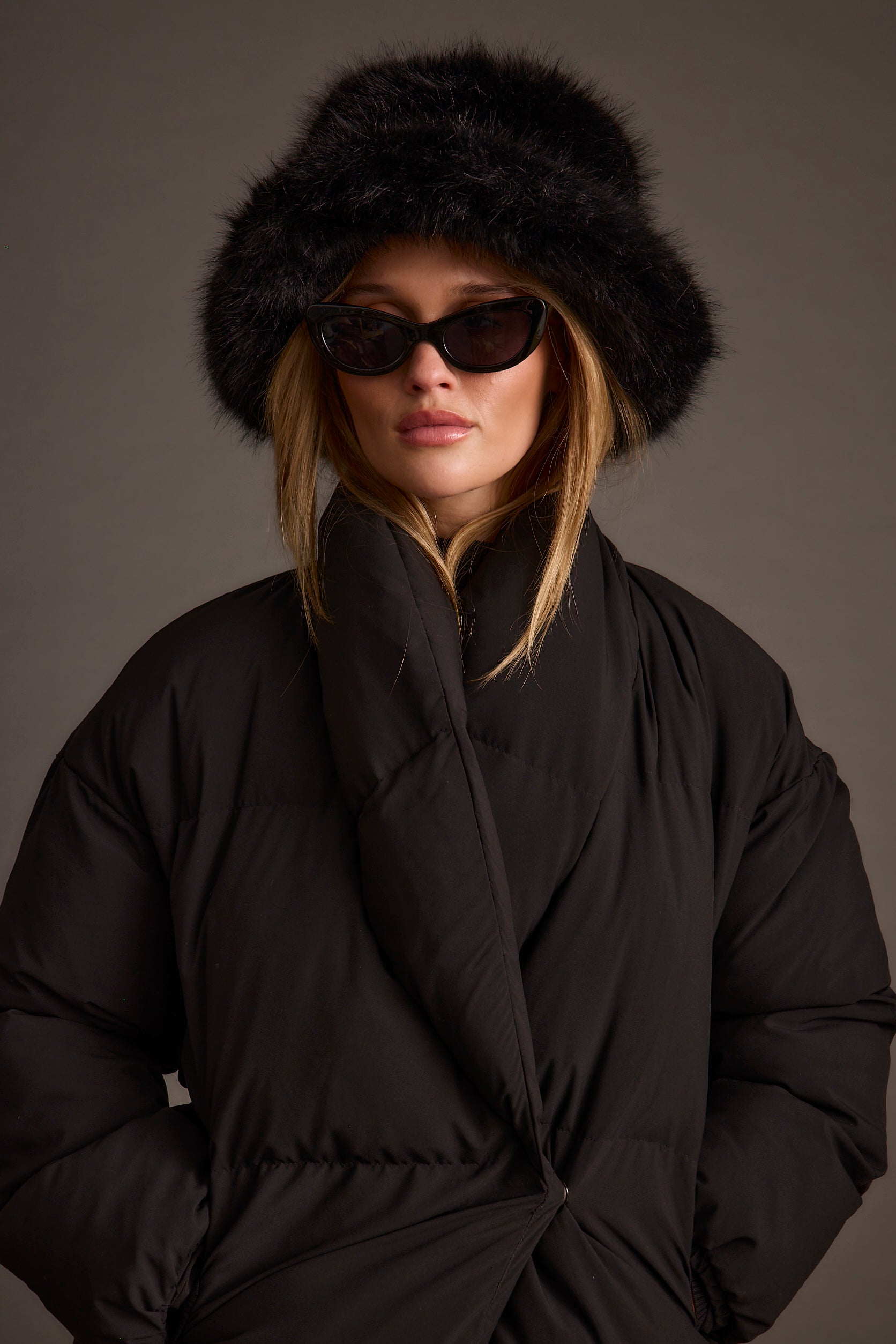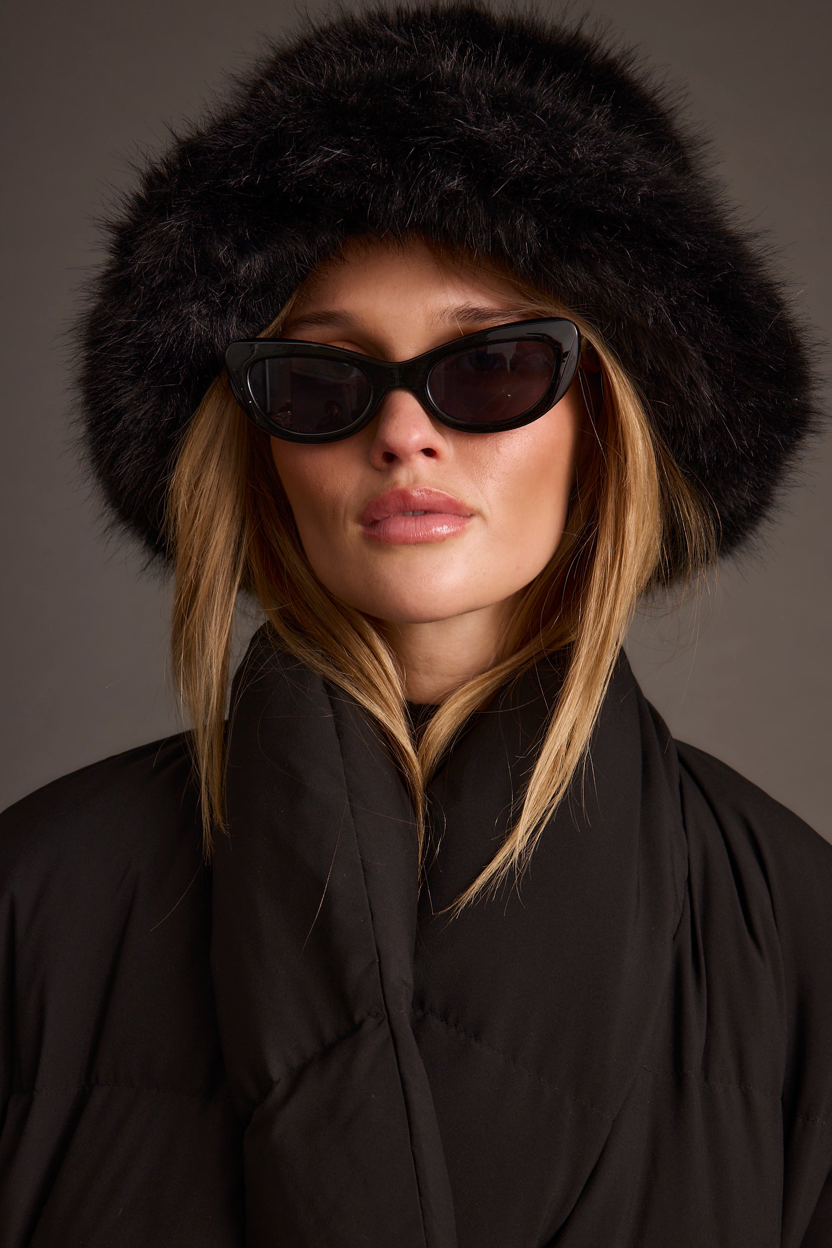 Bundle up in the Bucket Down Faux Fur Hat. Bringing the heat to your winter looks even in the coldest temps, this faux fur bucket hat will keep you warm and stylish from the slopes to the city.