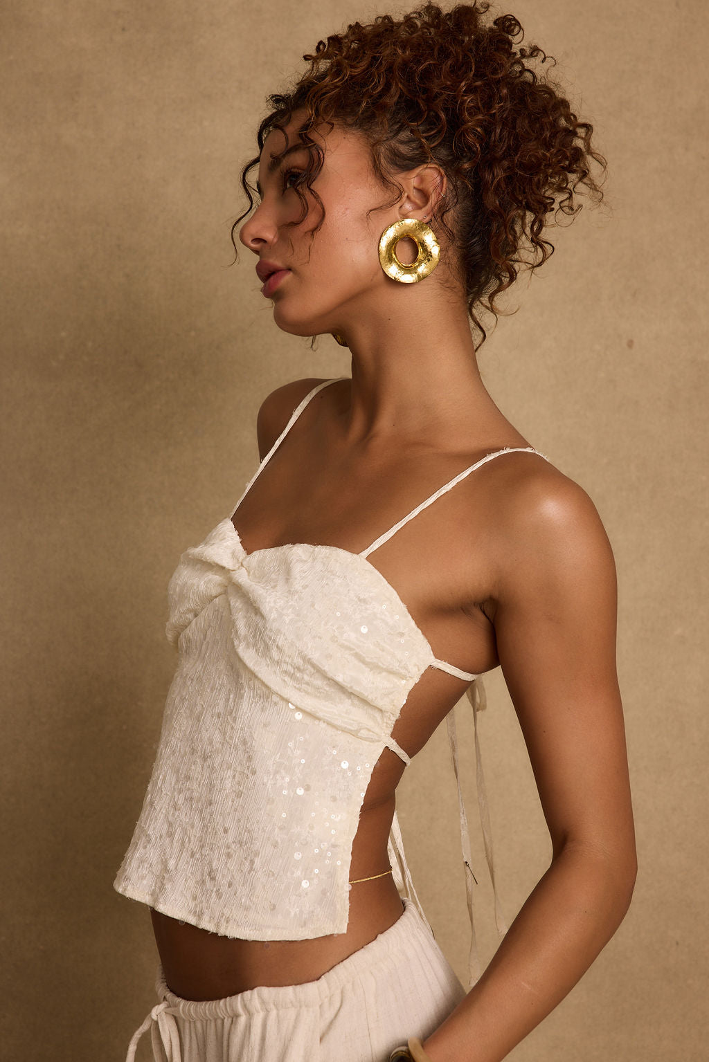 Built to sparkle, destined to slay. Where subtle sequins meet a sexy open-back design with flirty ties, the Silvia Ivory Sequin Top is effortless yet elevated . The Silvia's feminine silhouette makes it the perfect choice for chic dinners with the girls to nights out that turn into mornings. Pair lightweight linens for cocktails or a mini skirt to light up the dance floor—because when you shine in the Silvia, the night is yours.
