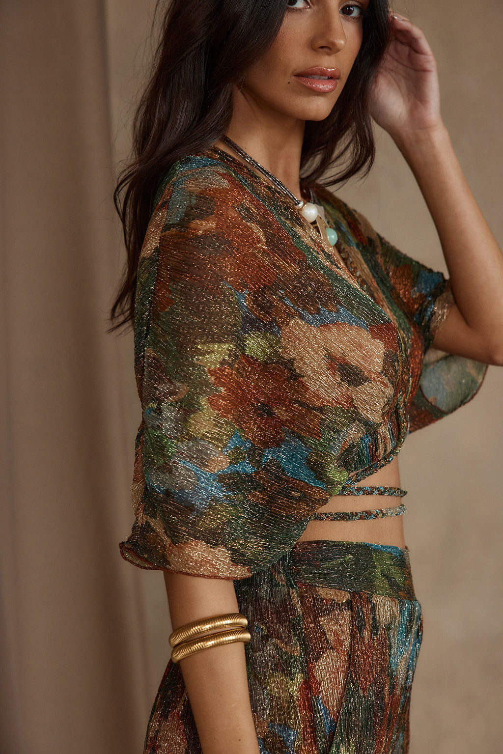 Have you ever seen something so perfect? The Kaia Metallic Floral Crop Top has your name written all over it, with the most flattering v-neck silhouette, crop length, and wrap-around waist ties. The pattern is unlike anything your closet has seen before and pairs effortlessly with our Kaia Metallic Floral Bottoms.