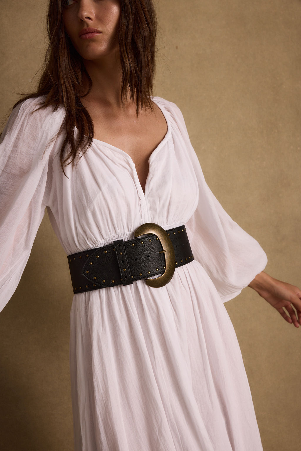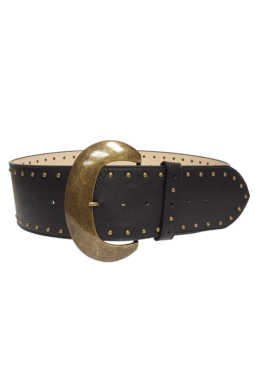 Bold accessories, golden touches, the Mabel Black and Gold Studded Belt is the statement accessory your summer wardrobe has been waiting for. With a thick black band and brushed gold buckle, it adds a touch of western edge and is timeless to every look. Cinch it over flowy dresses or pair it with high-waisted trousers for instant it-girl energy.