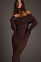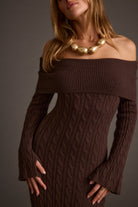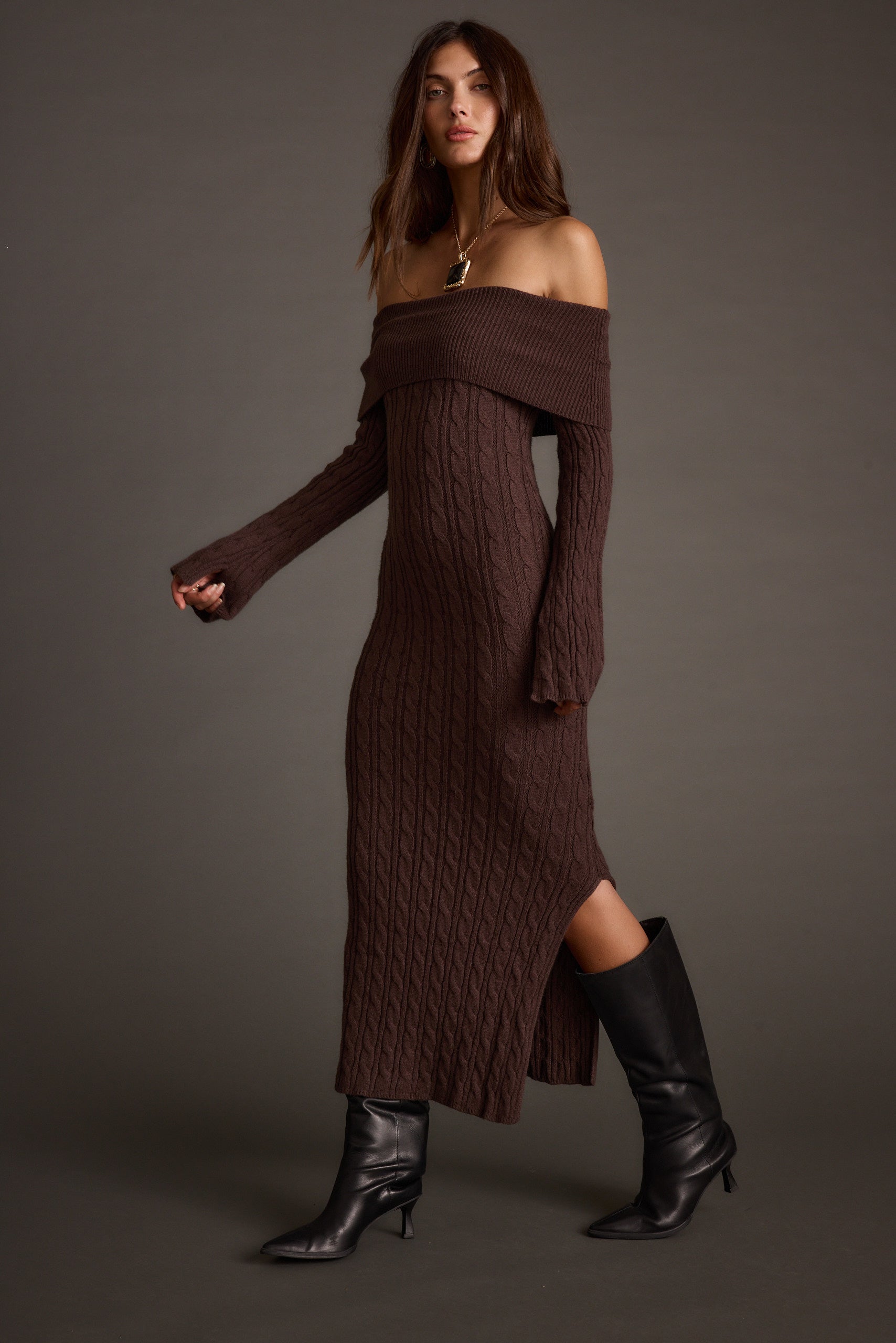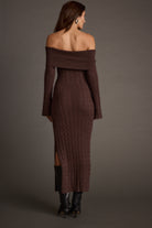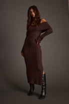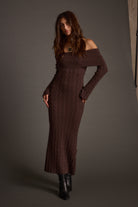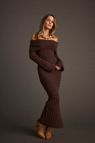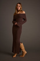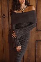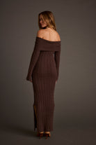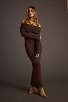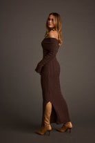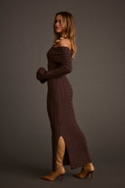 The Rhiannon Espresso Sweater Maxi Dress is your go-to for cozy-cool fall nights. Off-the-shoulder with a foldover detail and bell sleeves, it’s fitted in all the right places with a side slit that keeps it effortlessly stylish.