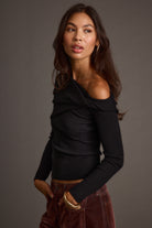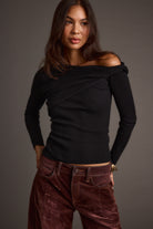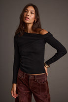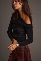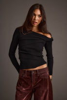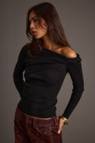 Our current obsession: the perfect off-the-shoulder moment. The Cindy Black Asymmetrical Sweater has a relaxed fit, soft ribbed texture, and that effortlessly cool drape that pairs best with great denim.