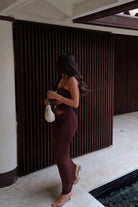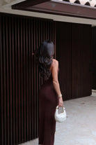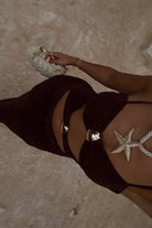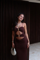 Felt cute, might traumatize a man later. Made from a chocolate brown sexy slinky material with flirty cutouts with luxe gold hardware, all eyes are on you in the Elena. Pack light and bring on the drama, and slip into something unforgettable this summer.