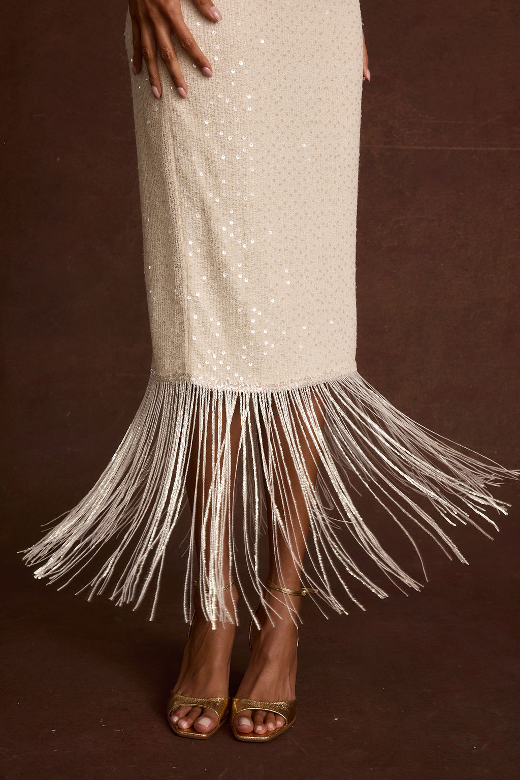 You deserve an iconic wifey moment in the Cordelia Ivory Sequin Midi Dress. It's killer for engagement parties, rehearsal dinners, or even your big moment. The warm ivory pairs perfectly with the shimmery sequin detailing along the halter neckline and fringe hem. Just throw it on and done.