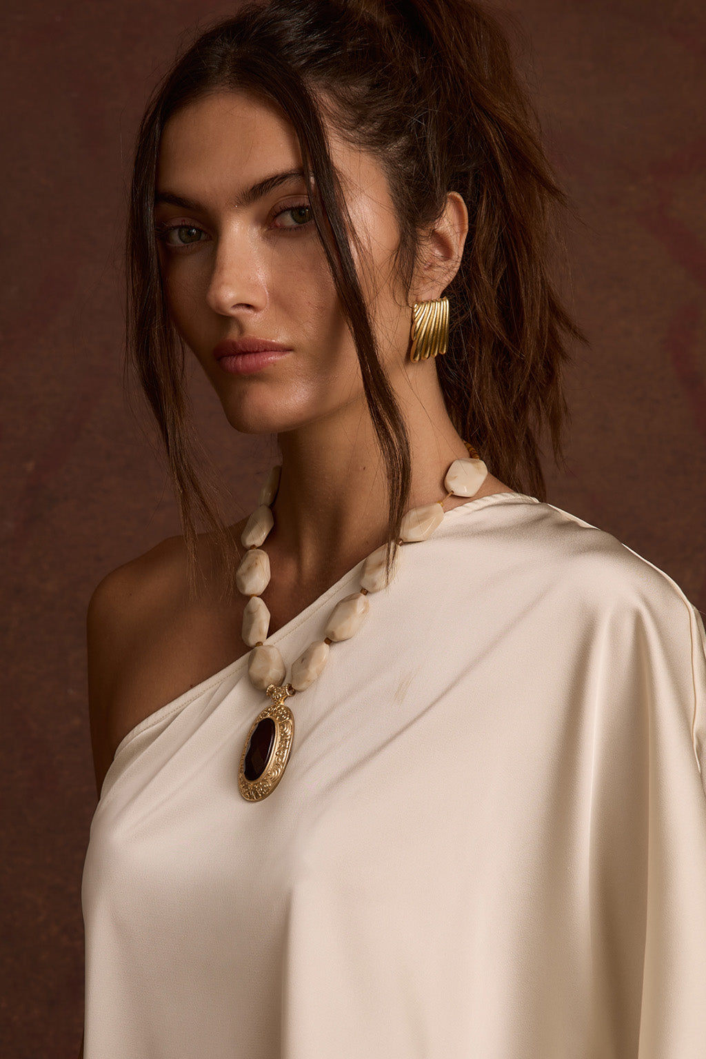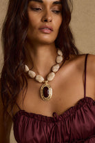 Earthy, elegant, effortlessly iconic.The Cressida Necklace brings grounded glamour with a bold stone pendant, gold detailing and white beading. Whether you’re a guest, a bride, or just vibing in your goddess era, it’s the statement piece that pulls everything together.