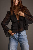 Meet your new go-to blouse. The Alexa Black Blouse features a plunging neckline, tiered ruffles, and a functional tie front, with sheer bell sleeves adding just the right amount of edge. Perfect tucked into jeans or paired with a skirt for any occasion.