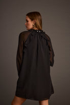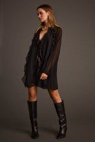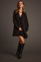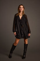 If you’re getting ready for holiday dinners or a night out, the Alice Black Chiffon Mini Dress is the perfect throw-on piece. The flowy A-line fit, sheer lantern sleeves, and ruffled neckline make it an instant go-to, and the beaded tassel ties add just the right detail.