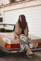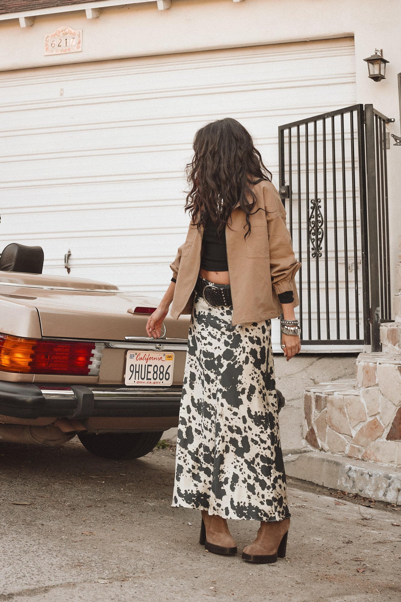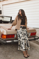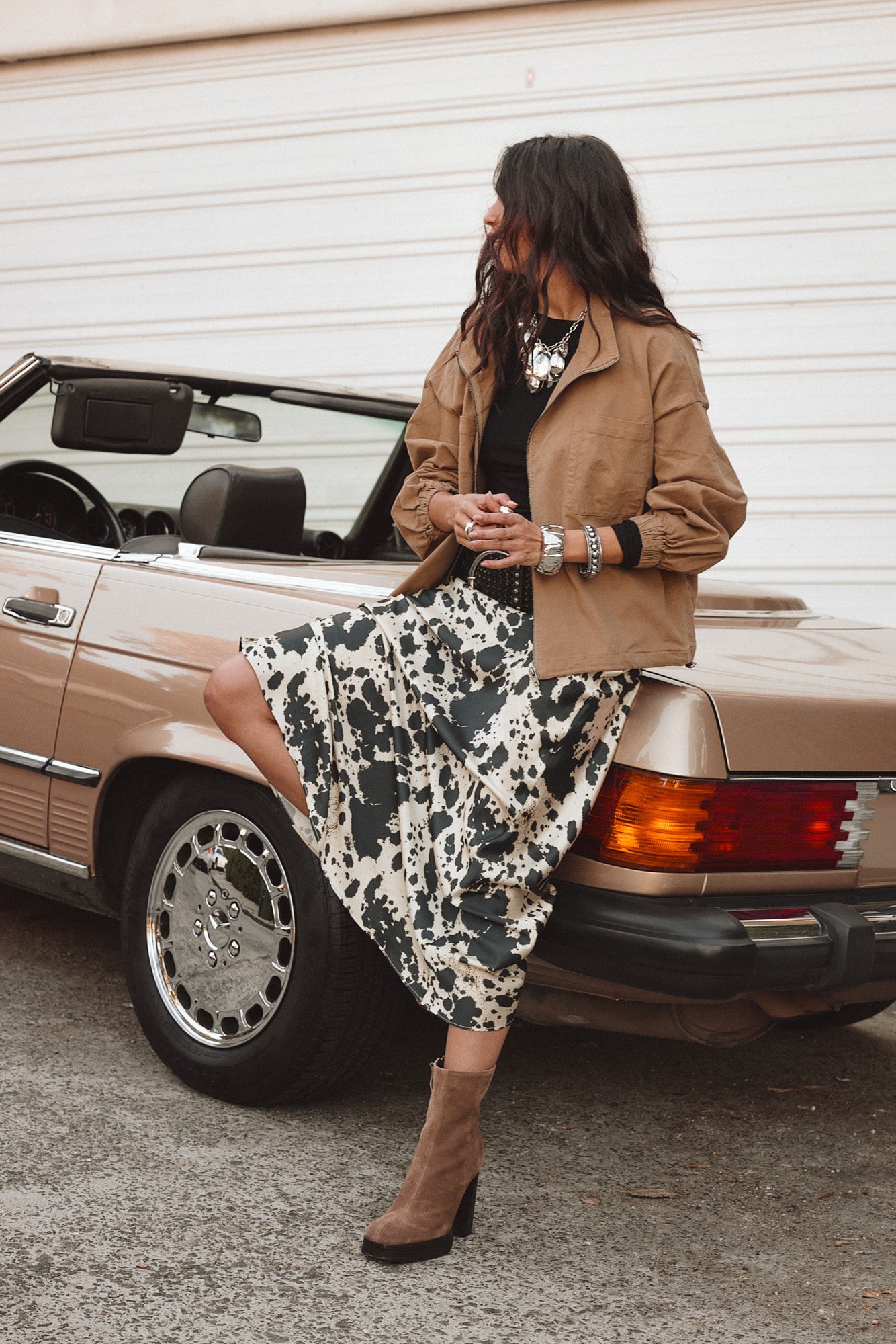The kind of piece that gets you asked “where’d you get that?”. The Kacey Cowhide Maxi Skirt features western-inspired cowhide print for a look that’s equally at home at a coastal brunch or a country fall festival. Pair with boots and a tucked-in blouse or keep it casual with a cozy sweater.