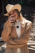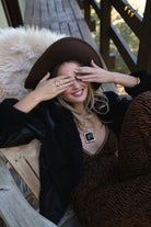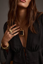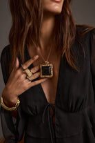 The Soleil Statement Necklace adds a touch of vintage-inspired shine to your holiday wardrobe. Designed as part of our coordinating belt, necklace, and earring set, its gold frame and black stone detail bring timeless luxury to any look.