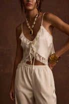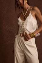 From Miss to MRS, the Cait Ivory Cami is the ultimate getting ready top. With a flirty tie front, lace trim and dreamy ivory satin material to compliment your future “future MRS” glow. Pair it with the Clear Breeze Satin Pants and a glass of champagne, and your ride-or-dies.