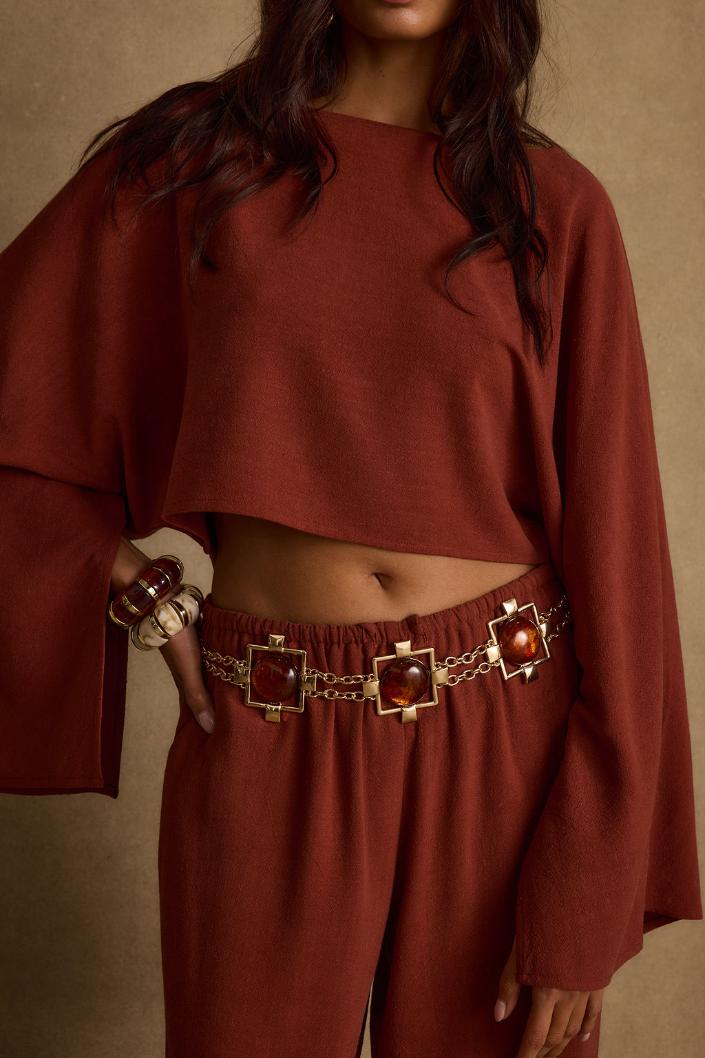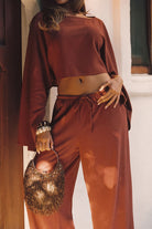 Pair it with the matching Clear Breeze Rust Linen Top for a fit that does the talking for you, because notifications are silenced. The easy, relaxed, soft linen, wide-legged silhouette, and mid to low-rise fit make it the perfect resort pant every time.