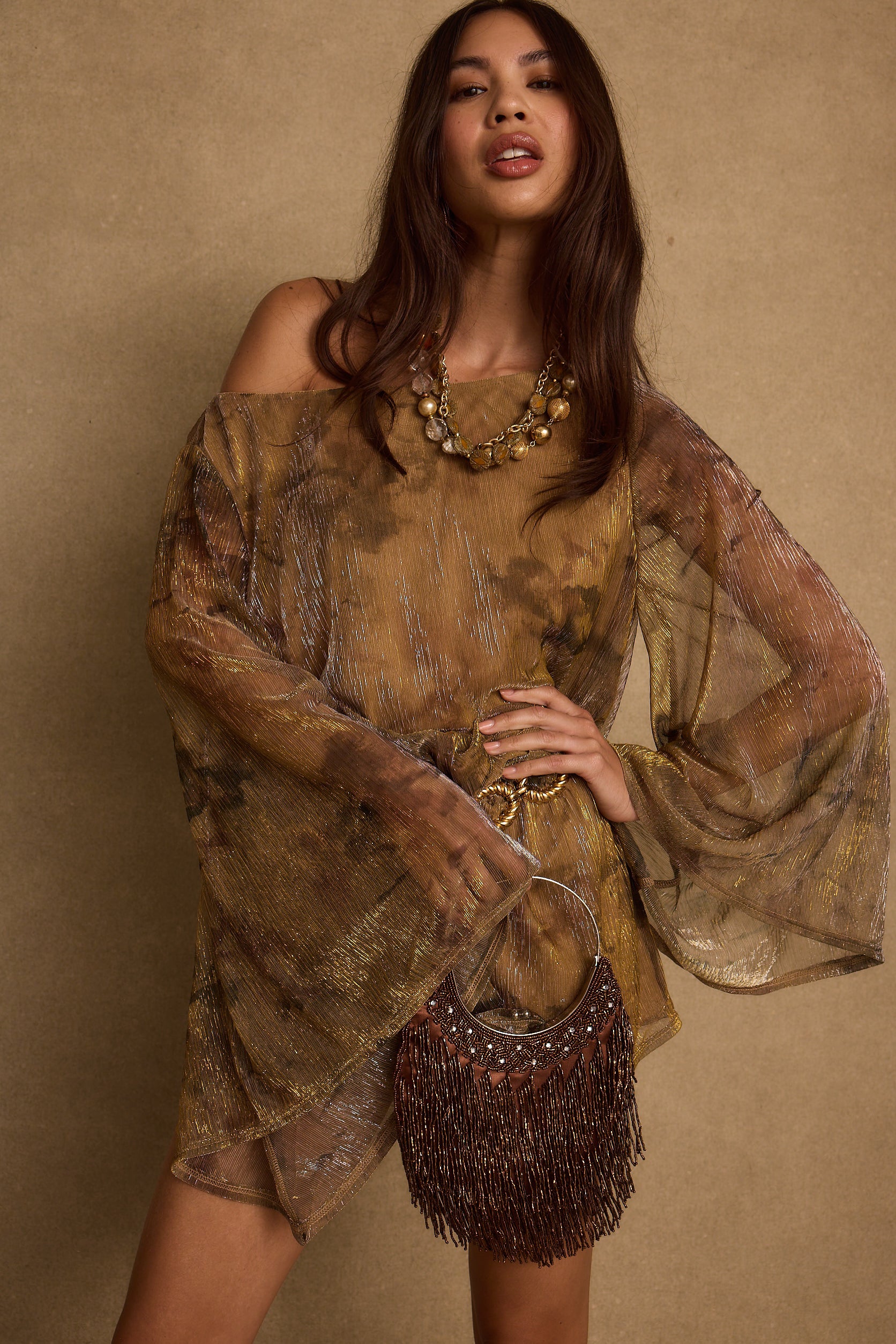 All drama, no effort, turn up the heat in the Kahlo Floral Micro Mini Dress. Made from a luxe metallic floral amber fabric, loose boho fit and off the shoulder neckline this drop waist beauty is effortlessly that girl.