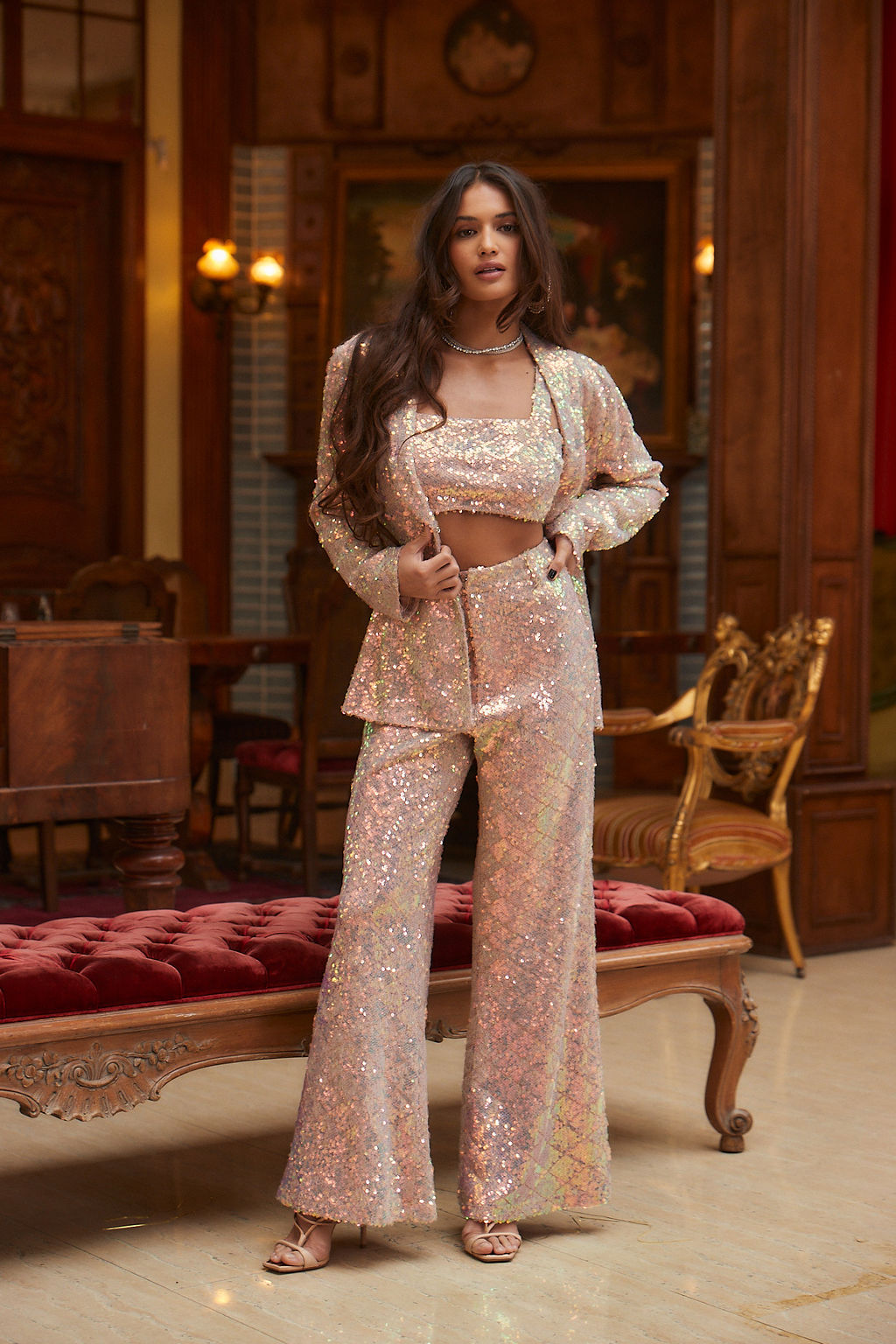 Calling all sirens! Grab the Marina Mermaid Print Sequin Blazer and make a bold statement at the office. Be extra bold and style it with the matching Marina Mermaid Sequin Crop Top and Marina Mermaid Sequin Trousers.
