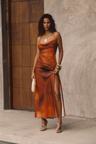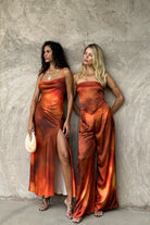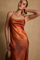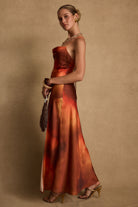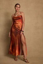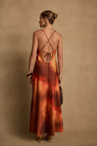 Wear something worth toasting to. Based on the best selling Natalia dress, we created a brand new print in a sunkissed sunset orange and red blend bathed in sunlight and shadows. With the same cowl neckline, sexy criss-cross back and slit, the Natalia Sunset Ombre Maxi Dress is made for unforgettable moments under the spanish sun.