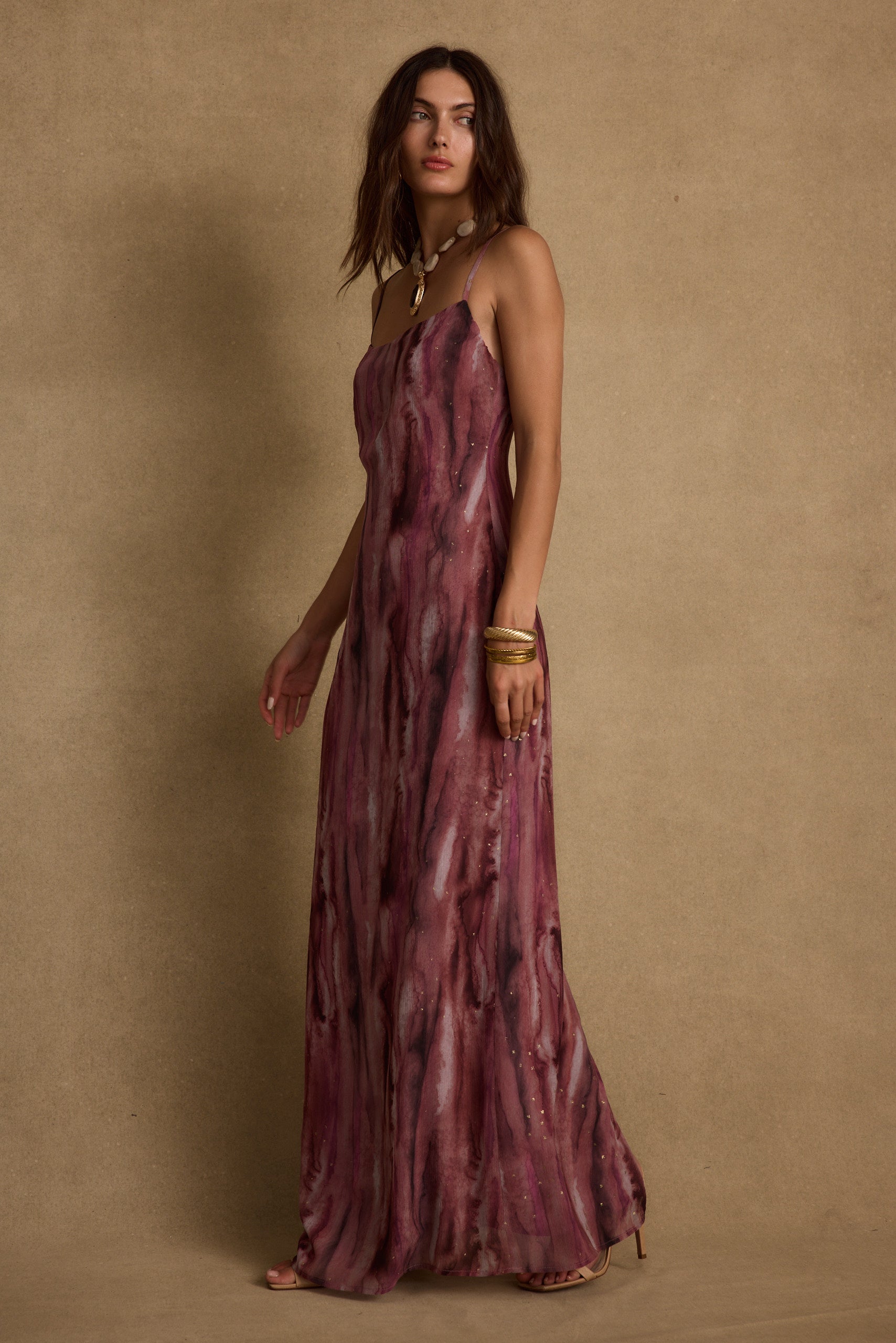 Serving looks, catching bouquets, the Nerisa Berry Maxi Dress does it all. Made from a romantic chiffon material with watercolor print with gold metallic foils that sparkle in the light, the Nerissa is perfect summer to fall wedding guest dress.