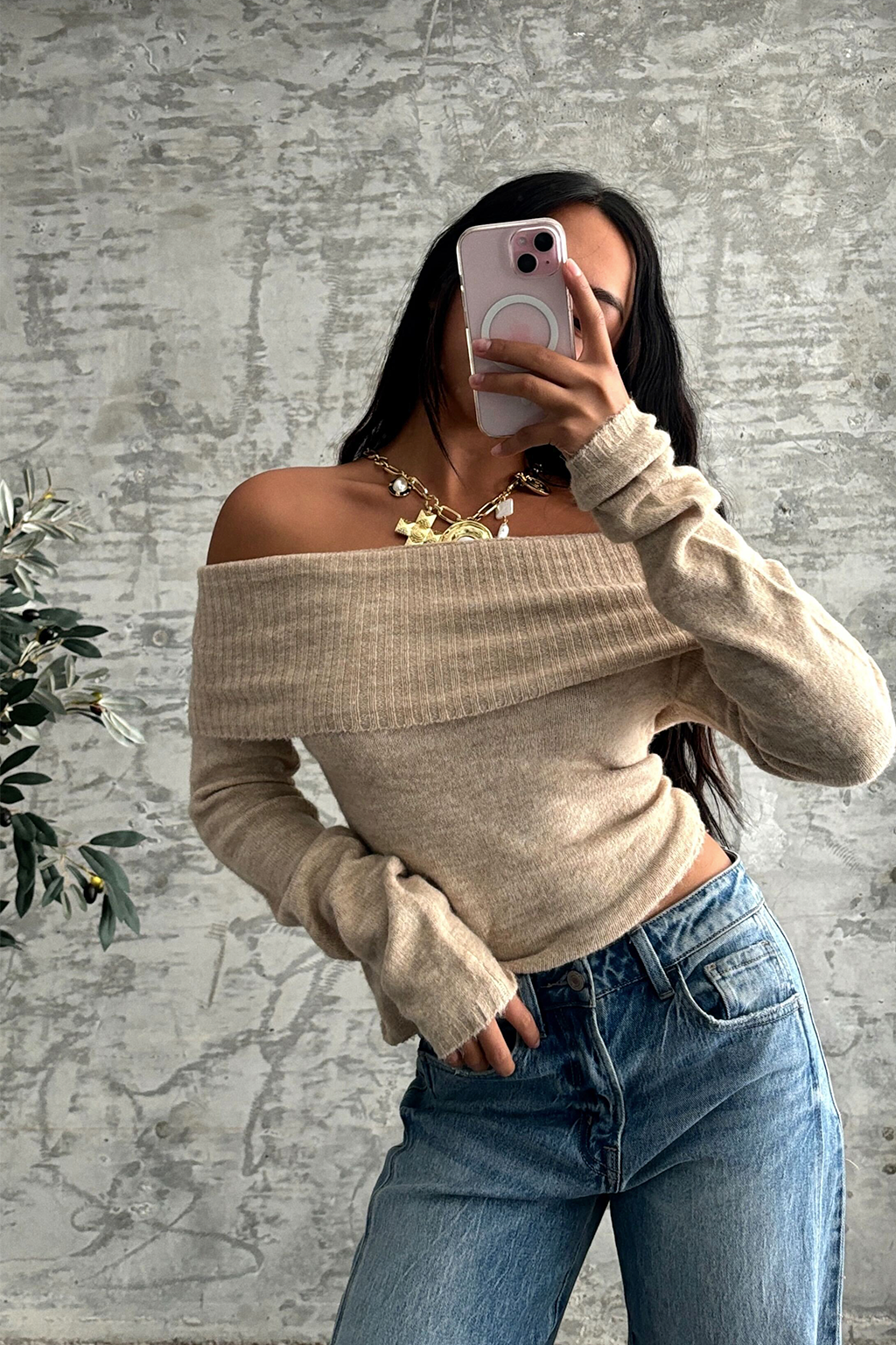 Nora Beige Off the Shoulder Sweater